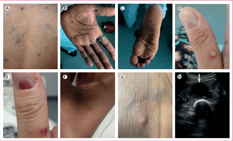 皮膚和軟組織特徵包括:(A 和 D)水疱或膿疱病變;(B 和 C) 手掌和足底的斑疹;(D 和 E) 手指的病變;(F 和 G) 更細微的丘疹和更小的水泡;(H) 和深部膿腫.