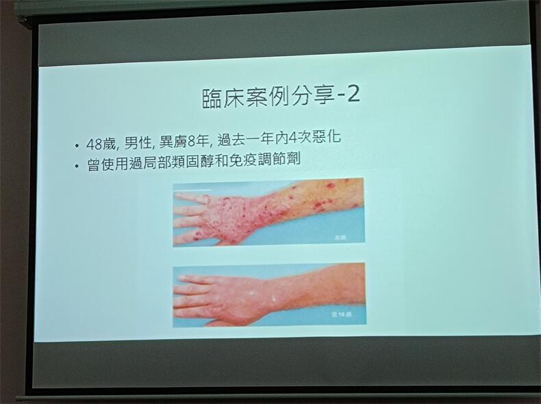 48嵗男性,8年異膚患者,病灶分佈於手臂到手掌背部,曾經使用外用類固醇與免疫調節劑,但是效果不明顯,經過16周治療,表面苔蘚化症狀與瘙抓痕跡減少很多,大約有7~8成的改善.