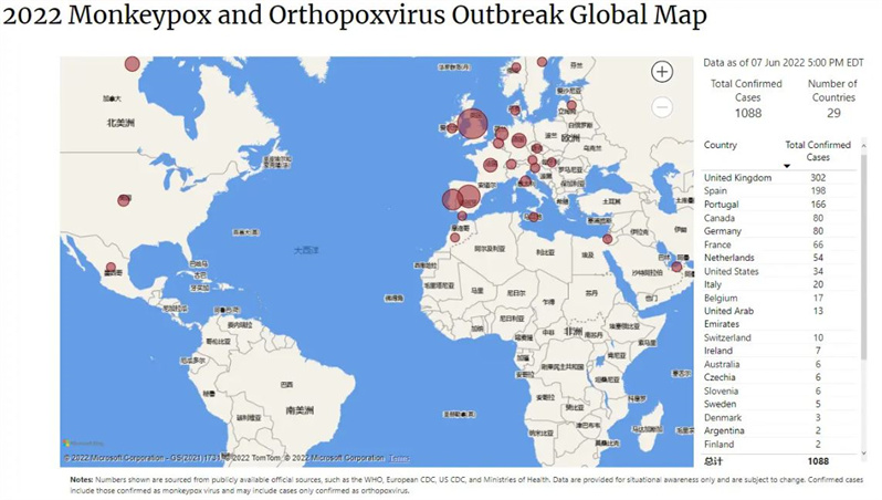 據世界衛生組織(WHO)通報數據,猴痘疫情近兩月的發展有逐步擴大的跡象:5月24日,全球 19個國家和地區向世衛上報了131例確診和106例疑似病例,到了6月8日,29個國家和地區上報了1000多例確診病例,縱觀猴痘的疫情歷史,這也是全球猴痘確診病例首次達到千位數.