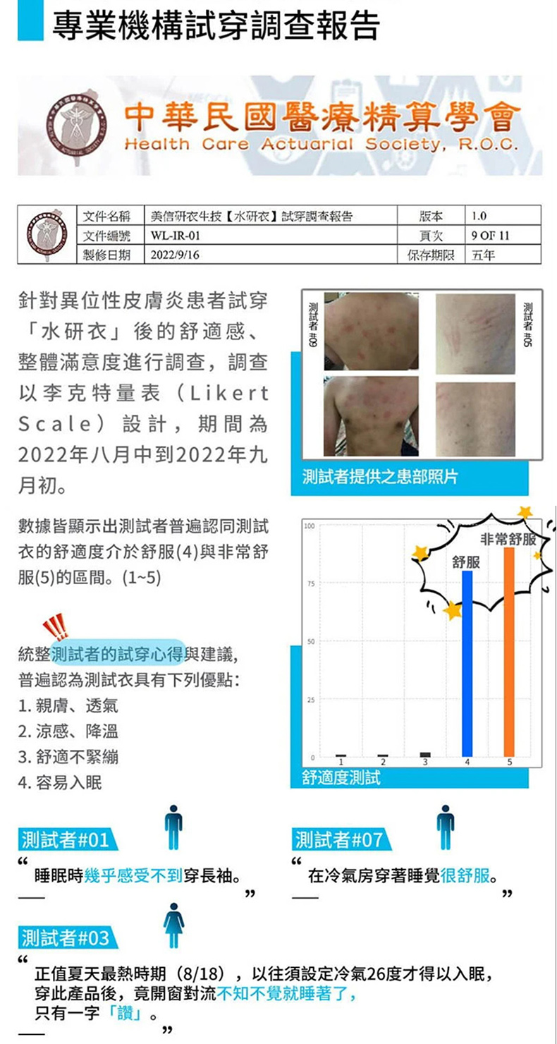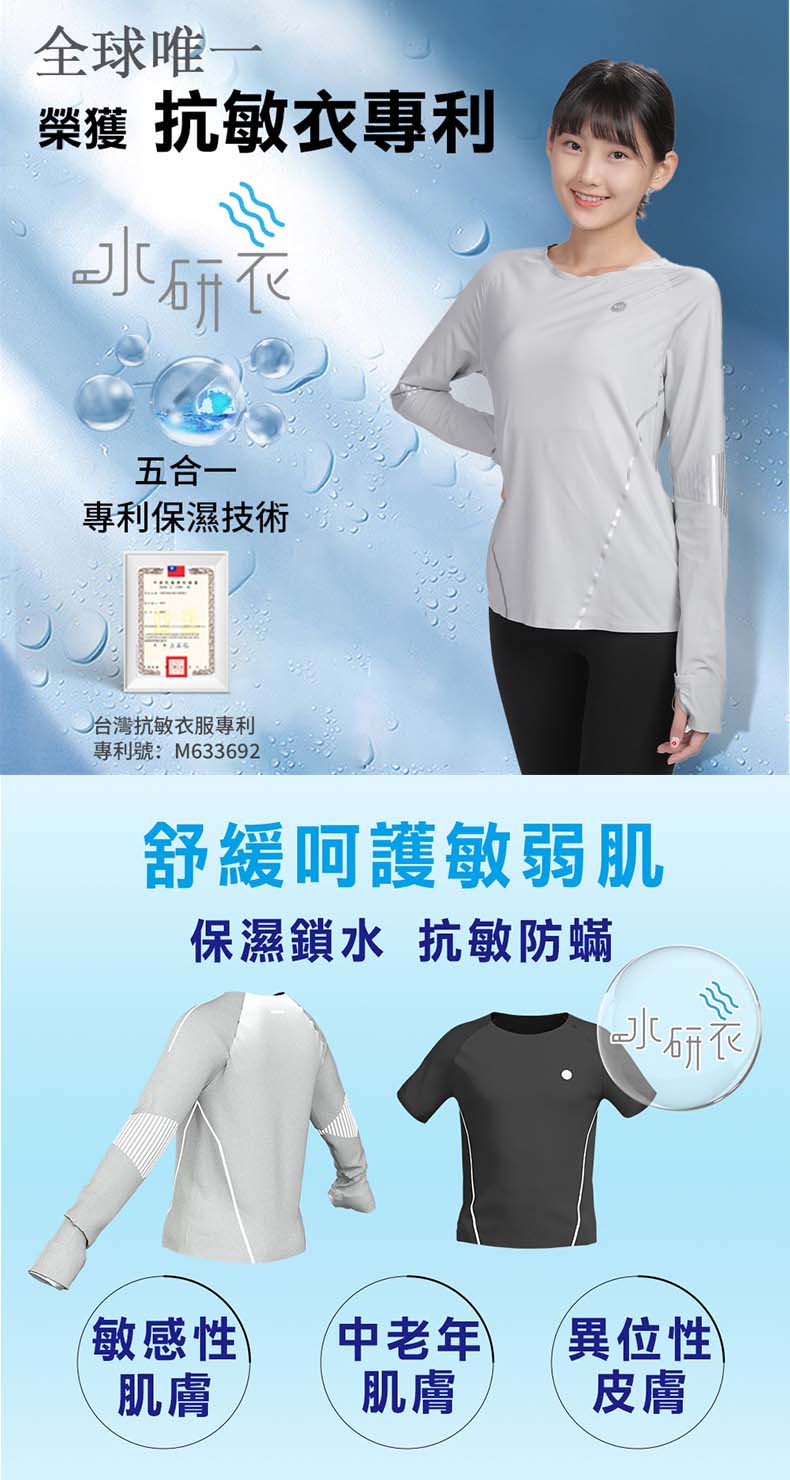 服裝是人體肌膚的第一道防線,「水研衣」藉由添加高保濕因子的水研纖維,搭配超音波製程與防抓抗敏設計,整件衣服不用一針一線,並以無刺激/無標簽/多面積覆蓋設計,提供更舒適的保濕抑菌衣物,達到提升皮膚滋潤與肌膚護理的功效,同時經過醫療精算協會的人體實穿測試,能有效舒緩肌膚的乾癢與摩擦,也是台灣第一件榮獲抗敏衣專利的居家護理衣物。